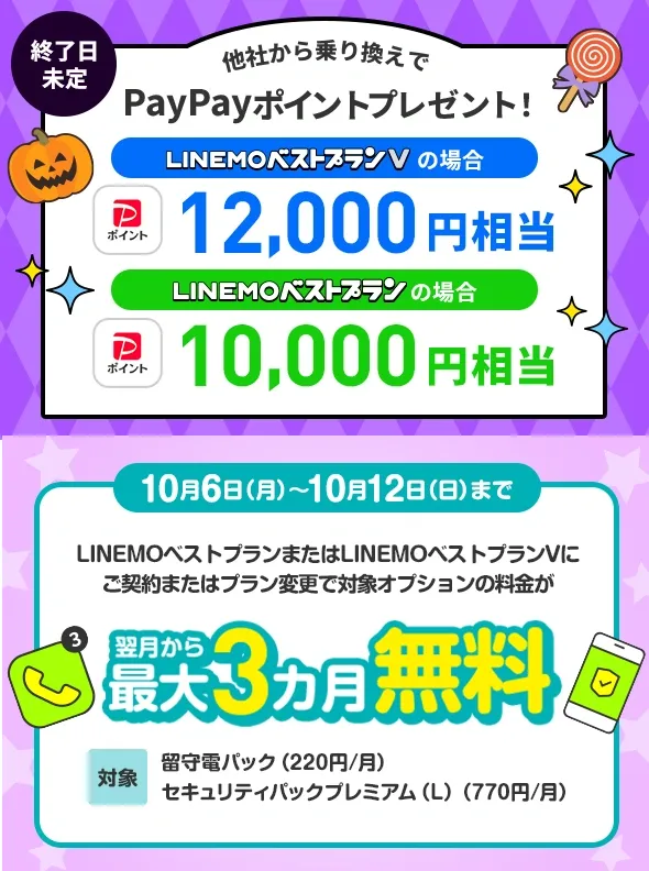 「LINEMOベストプラン」に他社から乗り換え契約で10,000円相当、新しい番号のご契約で3,000円相当、「LINEMOベストプランV」に他社から乗り換えで12,000円相当、新しい番号のご契約で6,000円相当のPayPayポイントがもらえます。