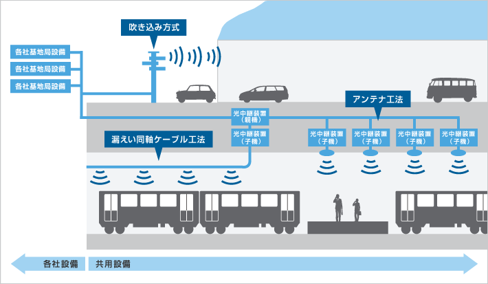 各携帯電話事業者の基地局設備から共用設備を経由して、地下空間、トンネル内などに設置された光ケーブルの先に、アンテナを一定距離ごとに設置し、連続したエリアを構築。 |